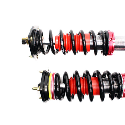 Godspeed Project's MAXX is our premier single-adjustable coilover suspension kit. These coilovers are designed to be a streetable race built coilover at an affordable price. It features a monotube damper that is made out of a carbon seamless steel 52mm tube with a 44mm internal piston providing maximum damper response. The cold-bent springs are made from high strength SAE9252 steel to optimize the balance between performance and comfort. Using high quality shock oil made in Italy, Godspeed Project can guarantee exceptional damper performance at any temperature on and off the track. The top of the shock is attached to the car using a high quality top hat that features a high performance bearing pillow ball mount (when applicable). The bottom shock brackets are made out of a T7075 forged aluminum or carbon steel brackets for lighter weight without sacrificing durability which also includes brake line brackets (when applicable). The MAXX offers 40 level of damper adjustability which can be set to your preference.