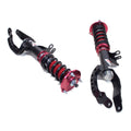 Godspeed Project's MAXX is our premier single-adjustable coilover suspension kit. These coilovers are designed to be a streetable race built coilover at an affordable price. It features a monotube damper that is made out of a carbon seamless steel 52mm tube with a 44mm internal piston providing maximum damper response. The cold-bent springs are made from high strength SAE9252 steel to optimize the balance between performance and comfort. Using high quality shock oil made in Italy, Godspeed Project can guarantee exceptional damper performance at any temperature on and off the track. The top of the shock is attached to the car using a high quality top hat that features a high performance bearing pillow ball mount (when applicable). The bottom shock brackets are made out of a T7075 forged aluminum or carbon steel brackets for lighter weight without sacrificing durability which also includes brake line brackets (when applicable). The MAXX offers 40 level of damper adjustability which can be set to your preference.