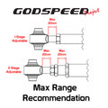 Godspeed Project adjustable lower control arms enable Ford Mustang launching harder, reducing wheel hop, and adding cornering consistency. Constructed from high tensile steel alloy with corrosion resistant finish is perfect for any lowered vehicle. Spherical bearings are chosen over rubber or polyurethane bushings for overall performance improvement. Engineered to replace factory arms and links to provide easier installation process.