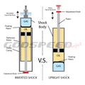 Godspeed Project Inverted Shock Technology brings motorsport-level precision and durability to your vehicle. Unlike traditional upright shocks, our inverted struts place the thicker shaft at the bottom for added strength and rigidity. This reduces flex under aggressive driving, delivering sharper steering response and improved stability.