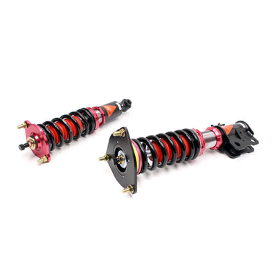 Godspeed Project's MAXX is our premier single-adjustable coilover suspension kit. These coilovers are designed to be a streetable race built coilover at an affordable price. It features a monotube damper that is made out of a carbon seamless steel 52mm tube with a 44mm internal piston providing maximum damper response. The cold-bent springs are made from high strength SAE9252 steel to optimize the balance between performance and comfort. Using high quality shock oil made in Italy, Godspeed Project can guarantee exceptional damper performance at any temperature on and off the track. The top of the shock is attached to the car using a high quality top hat that features a high performance bearing pillow ball mount (when applicable). The bottom shock brackets are made out of a T7075 forged aluminum or carbon steel brackets for lighter weight without sacrificing durability which also includes brake line brackets (when applicable). The MAXX offers 40 level of damper adjustability which can be set to your preference.