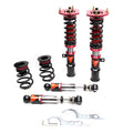 Godspeed Project's MAXX is our premier single-adjustable coilover suspension kit. These coilovers are designed to be a streetable race built coilover at an affordable price. It features a monotube damper that is made out of a carbon seamless steel 52mm tube with a 44mm internal piston providing maximum damper response. The cold-bent springs are made from high strength SAE9252 steel to optimize the balance between performance and comfort. Using high quality shock oil made in Italy, Godspeed Project can guarantee exceptional damper performance at any temperature on and off the track. The top of the shock is attached to the car using a high quality top hat that features a high performance bearing pillow ball mount (when applicable). The bottom shock brackets are made out of a T7075 forged aluminum or carbon steel brackets for lighter weight without sacrificing durability which also includes brake line brackets (when applicable). The MAXX offers 40 level of damper adjustability which can be set to your preference.