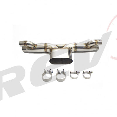 FlowMaxx exhaust center section for Porsche 991.1 / 991.2 GT3 / GT3 RS models are constructed with 100% T201 stainless steel with TIG welded handcrafted for durability. The exhaust is a direct replacement to the factory exhaust, no modifications required. Oval shape exhaust tip provides a single large exhaust exit appearanc.